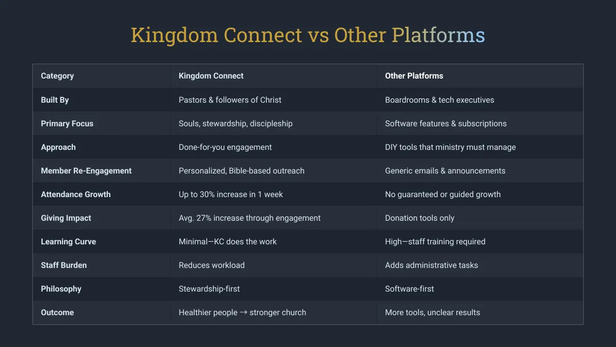 Kingdom Connect is more than a collection of tools. It is a complete ministry operating system designed to help churches grow engage and serve more effectively.